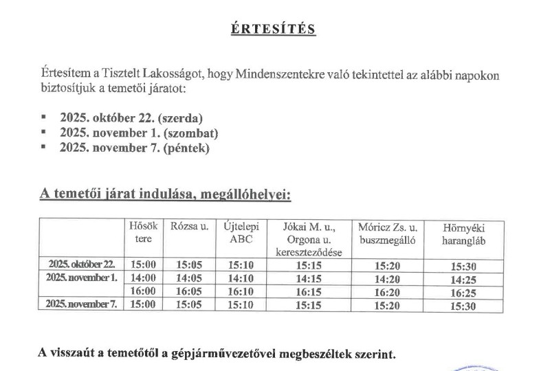 Értesítés temetői járatról